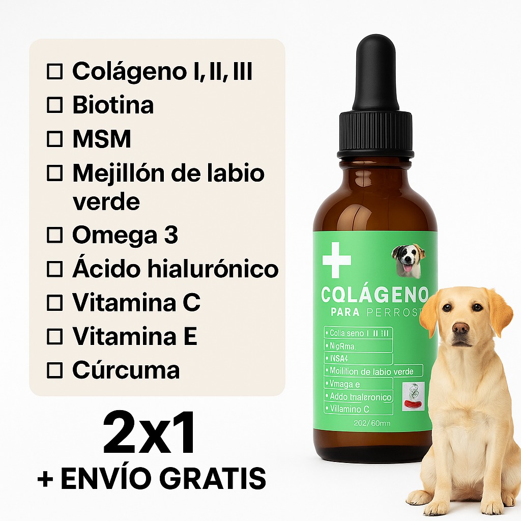 ¡Nuestro 2x1 COLÁGENO LÍQUIDO PARA PERRO te ofrece una fórmula pensada para apoyar las articulaciones, tendones y el tejido conectivo de tu mascota —todo en una presentación líquida fácil de administrar.
